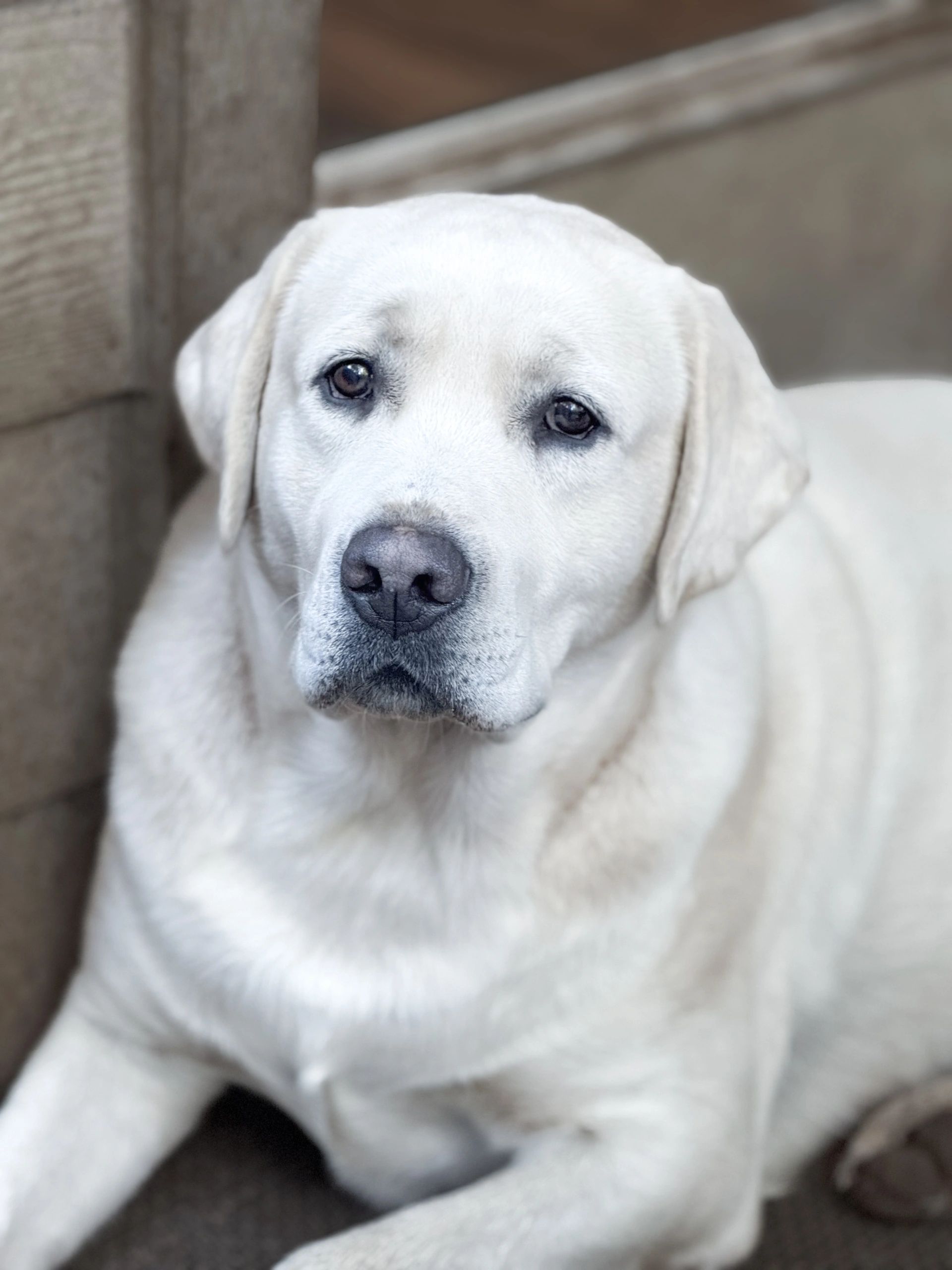 Cleo is a light yellow AKC English Labrador Retriever. She weighs 80lbs but she still thinks she’s a lap dog. She is very calm and loves to cuddle. She also enjoys going on walks and swimming in the river. She is always watching over the children and the other dogs.